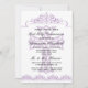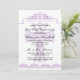 First holy communion invitations feature a cross design with calligraphy borders and multiple text fields that you can customise with your personal details on the front while the back has a damask pattern in a colour palette of purple, black, and white.