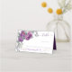 Elegant purple floral wedding table place card with handwritten script typography and space for you to add the table number and your guest's name. The design has purple and gold confetti with watercolor rose peony flowers in shades of purple and magenta and, grey green leaves and foliage. Please browse my Plush Purple Floral collection for matching items.