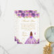 This elegant and glamourous sweet sixteen thank you card features a beautiful princess with brown red hair and fair skin in a purple ball gown. The text combines handwritten script and modern sans serif fonts for a classy and sophisticated look. The floral arrangements, butterflies and gold confetti create the perfect blend of rustic and chic.