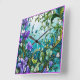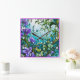 A vibrant design featuring purple flowers intertwined with lush greenery against a blended blue background, showcasing vivid floral patterns and natural elements.