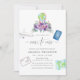 Purple flowers in a hand painted bouquet travel themed bridal shower invitation designed to be quickly and easily customised for your special day.