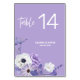 Design features purple watercolor flowers at the left bottom corner and purple background. Easy personalisation process start with clicking button 'PERSONALIZE' that gives you the table card automatically for your purpose.