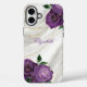 Purple Floral White Marble iPhone 16 Plus Case. Elevate your iPhone with this elegant cover features personalised name in script lettering. It's a luxurious design of chic white and gold marble accented with emerald green and gold floral roses. Inspired by the timeless beauty of gemstones and geodes, the marble-like swirls of pristine white and shimmering gold create a sophisticated backdrop. The rich emerald green roses with delicate gold accents add a touch of opulence and nature's grace, making this case a stunning blend of modern luxury and organic charm. Designed for both style and protection, this slim and durable case shields your phone while showcasing a design that's perfect for lovers of fine aesthetics and gemstone-inspired elegance. A must-have accessory or thoughtful gift for anyone who appreciates beauty and sophistication.