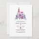 Purple magnolias and roses in a hand painted bouquet engagement party wine tasting invitation designed to be quickly and easily customised for your special day.