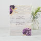 Design features a printed coloured floral element in shades of purple, lavender, ultra violet and plum with peony blooms and wood barn bark line and string of lights. Calligraphy script or type writing. Mix and match collection piece. Great for your wedding celebrations!