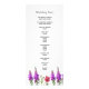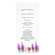 An elegant and romantic wedding program. A white background decorated with summer flowers in purple, white and pink, like purple foxgloves. Templates for your names, dates, details of the ceremony and the party. Black letters.