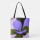 A modern tote bag featuring a bold purple flower with clean geometric leaves.