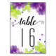 Purple ethereal flowers calligraphy flloral wedding table number card. It includes a pretty bouquet of violet purple flowers and green leaves. The word "table" is written in a cursive script handwritten calligraphy style font.