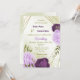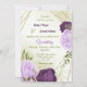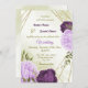 Beautiful wedding invitation featuring lilac and eggplant purple flowers and green leaves