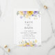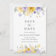 Invite friends and family in style and set the tone for your special day with this charming save the date card. Design features purple and yellow watercolor flowers and greenery on white background.