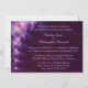 An elegant wedding invitation with an intricate feather like fractal design in shades of violet and pink on the front and a simpler version on the reverse, both with a dark burgundy background. The script font is in pale pink, but can be customised to another colour.