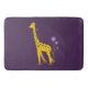 Funny giraffe bath mat with a cartoon giraffe nibbling on a light purple flower and holding some flowers with its tail while roller skating, on dark purple background.