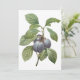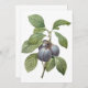 Vintage illustration botanical fruit design featuring ripe purple Garden Plums (Prunus domestica sp.) on a tree branch with bright green leaves. One leaf has been eaten by some bugs or insects. By the famous floral botany artist Pierre Joseph Redoute (1759-1840).