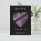 A large purple steampunk heart with gears and swirls on a black background on RSVP cards. The text is easy to personalise on these.