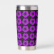 A trendy, stainless steel, thermal tumbler for your hot or cold drinks that features the photo image of a purple Cranesbill Geranium flower printed in a repeating pattern on a black background. A fun, floral design!