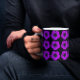Enjoy your favorite hot or cold beverage in this coffee mug that features a wrap-around photo image of a purple Cranesbill Geranium flower on a black background and printed in a repeating pattern. A fun, floral design! Select your mug size and style as desired.