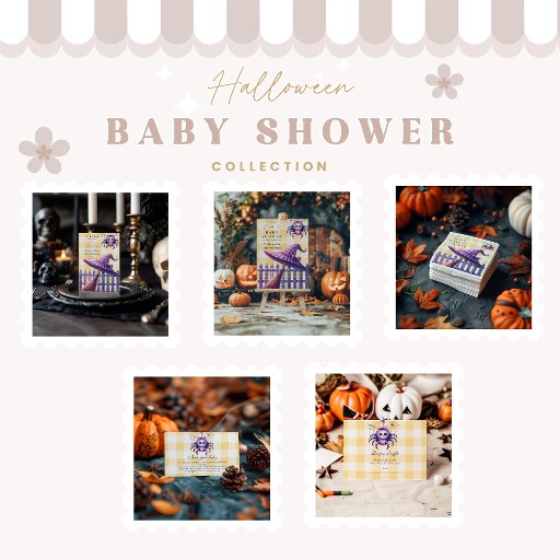 Celebrate your little boo with this charming Halloween baby shower design! Featuring a cosy gingham background, a purple witch hat, wooden broom, and a bow-tied spider hanging above a picket fence, this invitation blends spooky with sweet in all the right ways. Perfect for a whimsical autumn party full of warmth and magic.
