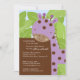 Adorable Baby Shower invitation featuring a purple giraffe with brown polka dots set on a jungle leaf background. Matching items available in our shop. Perfect for a baby girl baby shower. ©Stockberry Studio