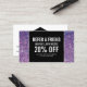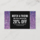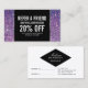 Coordinates with the Pink Glitter and Glamour Beauty Business Card Template by 1201AM. A deep, rich purple glittery background image provides a glamourous backdrop to this customisable referral card template. Your name or business name is elegantly styled in a faux silver trimmed nameplate for a modern logo on the backside. Personalise the text for your own promotion or offering. Great for salons, hair stylists, makeup artists, nail designers, boutiques and more. © 1201AM CREATIVE
