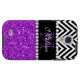 GIRLY MODERN PURPLE GLITTER (PRINTED EFFECT) WITH BLACK AND WHITE CHEVRON PATTERN, MONOGRAMMED WITH YOUR NAME, YOUR INITIAL OR MONOGRAM ON A BLACK STRIPE OR BAND WITH A BORDER OF PRINTED WHITE DIAMONDS. TRENDY, CHIC, COOL CUTE DESIGN FOR HER, THE TRENDSETTER, THE FASHIONISTA