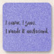 Protect tabletops or furniture surfaces with a Purple Glitter "I made it awkward" Plastic Coaster. Coaster design features the text "I came. I saw. I made it awkward." in a handwritten font against a bright glitter purple background. Additional gift items available with this design as well as a variety of colours.