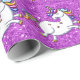 A colourful, sparkly purple unicorn wrapping paper with a pattern of cute little chubby unicorns with rainbow coloured hair, mane and tail, gold stars on their bodies and golden hooves. They're dancing over a glittering purple background of sparkling glitter. This purple unicorn wrap would be ideal for a children's birthday party gift, for unicorn crafts, and more.