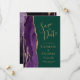 The left-hand edge of this elegant modern wedding save the date card features a purple watercolor agate border trimmed with faux gold glitter. The customisable text combines gold-coloured handwriting, copperplate and italic fonts on an emerald green background. The reverse side features a matching purple and gold agate design.