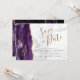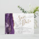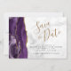 This elegant modern save the date card features a purple watercolor agate border trimmed with faux gold glitter. The customisable text combines gold-coloured handwriting script with black sans serif font on a white and silver grey marble background. The reverse side features a matching purple and gold agate design.