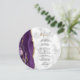 The left-hand edge of this elegant modern wedding menu features a purple watercolor agate border trimmed with faux gold glitter. The customisable text combines gold-coloured whimsical handwriting script and black copperplate font on a grey and white marble background. The reverse side features a matching purple and gold agate design.