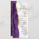 The left-hand edge of this elegant modern wedding program features a purple watercolor agate border trimmed with faux gold glitter. The customisable text combines gold-coloured calligraphy script and black sans serif fonts on a grey and white marble background.