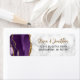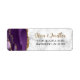 The left-hand edge of these elegant modern wedding return address labels features a purple watercolor agate border trimmed with faux gold glitter. The customisable text combines gold-coloured calligraphy script and black sans serif fonts on a grey and white marble background.
