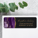 The left-hand edge of this elegant modern wedding invitation return address label features a purple watercolor agate border trimmed with faux gold glitter. The customisable text combines gold coloured handwriting and copperplate fonts on an off-black background.