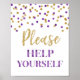 Please help yourself sign for baby shower, bridal shower, birthday party or wedding in dark purple and gold confetti pattern. Please note glitter effect is photographic effect only.
