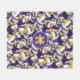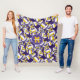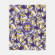 This volleyball team colours fleece blanket for girls features a pattern of stylised purple, gold and white volleyballs of varying sizes turned every which way on a customisable darker purple background - the volleyballs' purple and gold panels are blended with an artsy, girly floral pattern - personalise with athlete's name and monogram or jersey number - by katz_d_zynes