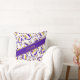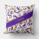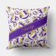 This cool volleyball team colours throw pillow for her features a pattern of varied size stylised purple, gold and white volleyballs turned every which way overlying a volleyball net detail graphic - the volleyballs' purple & gold panels are blended with an artsy, girly floral pattern - personalise her name in a sophisticated handwritten font on a bold, angled, full width purple colour strip - background and name strip colours are customisable - by katz_d_zynes