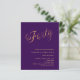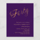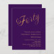 A modern, stylish invitation for a 40th birthday party. A purple coloured background and the word Forty written with elegant large script letters in faux gold. Personalise and add a name and party details.