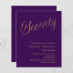 A modern, stylish invitation for a 70th birthday party. A purple coloured background and the word Seventy written with elegant large script letters in faux gold. Personalise and add a name and party details.