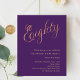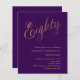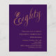 A modern, stylish invitation for a 80th birthday party. A purple coloured background and the word Eighty written with elegant large script letters in faux gold. Personalise and add a name and party details.