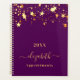 A stylish girly and feminine dark purple colored background with shining faux gold stars dripping, drips. Personalize and add a year, any year, name, and title. A planner for organizing business clients, to do lists, or your daily life. The name is written with a large trendy hand lettered script with swashes. To keep the swashes only delete the sample name, leave the spaces or emoji's in front and after the name.