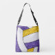 This team colours volleyball crossbody bag for a female coach features the image of an abstractly oversized volleyball that has purple, gold and white panels, upon which you can customise the coach's name, team name and mascot name and sports season year/years - the volleyball's purple and gold panels are blended with a floral kaleidoscopic pattern for an artsy, textured appearance that is girly but sporty - by katz_d_zynes