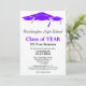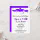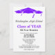 This vertical format minimalist class reunion invitation design features black and purple text on an all white background with three purple graduation caps as the top border. The back is solid purple matching the front text colour. Personalise your information, remove information or edit using the design tool to select a font colour, size, and style your prefer.