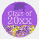 A deep purple background sets the stage for this purple graduation sticker. A wide bottom border of yellow daffodils and purple crocuses creates a beautiful display of spring flowers. At the top of the purple graduation sticker is a darker purple graduation cap or mortar board. Class of 2017 is written in the middle in a large and bold font. Acutally the date is 20XX and you can customise it to any year. Sophisticated and chic floral graduation sticker.