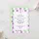 The baptism invitation is perfect for a baby girl. Featuring pretty purple, green and white dots with a white cross in a circle at the top. The middle has a white area to add plenty of text. The back is a soft green colour to match the invitation.
