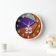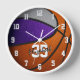 This personalised basketball wall clock features the realistic image of a basketball that has two recolored panels--one purple and one grey--with overlying clock face numerals - personalise with player name in an "autograph" style font overlying the athlete's jersey number - by katz_d_zynes
