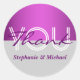 This round sticker has a two tone vibrant purple and light grey background on which the words thank you and the couples name appear. CUSTOMIZE IT - Change the wording to suit your requirements, or delete templates by using the "customise it" button. IDEAL FOR - Elegant, classy and stylish "formal gatherings, events & parties" such as weddings, hollywood engagements, "purple and grey themed" birthdays, "bat mitzvah", "sweet sixteen" or sweet 16; quinceanera and "bridal shower" parties, or for anyone looking for a timeless and classic design that is ultra feminine. They make great envelope and "wedding favour" seals. CUSTOM REQUESTS – If you would like this design on another product, or would like to discuss any changes you may require, please feel free to contact me on clientrequestrw@gmail.com and we can discuss your requirements, and costs, if any apply.