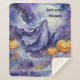 Cuddle up in a blanket that's as magical as Halloween night itself! This cozy throw features a whimsical ghost drifting through a purple-hued sky, guiding a trio of pumpkins under the moon's glow. It's the perfect blend of spooky and sweet—ideal for adding a touch of Halloween fun to your couch, bed, or favorite reading nook. You can personalize this blanket with your name or other custom text, or leave it empty.