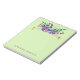 This colourful floral notepad features a hand drawn floral graphic on the top. The design offers the colours: purple, orange, dark pink and green. The background colour is a light lime green, although it can be changed to any colour available by choosing customise it. Customisable text, near the bottom, allows you to add a personal name.
