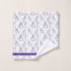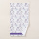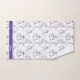 Colours of purple and light blue are used in making this snowman seamless bath towel set.  Hand drawn illustration of a cute snowman with top hat, scarf, and carrot nose.  He stands on a hill of snow near a Christmas tree with a star.  "Merry Christmas!" text is included in pattern on a purple and white stripe banner.