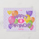 This fun and colourful birthday card for a girl is downloadable and features the message "Happy Birthday" spelled out in realistic, whimsically arranged purple frosted cutout cookies on the front of the card surrounded by multicolor balloons - message on back and child's age and name can be personalised - two balloon-shaped cutout cookies accent the back of the card - background is a pattern of small white polka dots on pale purple - by katz_d_zynes