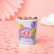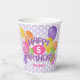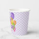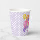 These fun and colourful birthday party paper cups feature the message "Happy Birthday" spelled out in realistic, whimsically arranged purple frosted cutout cookies surrounded by multicolor balloons - child's age and name can be personalised - background is a pattern of small white polka dots on pale purple - by katz_d_zynes